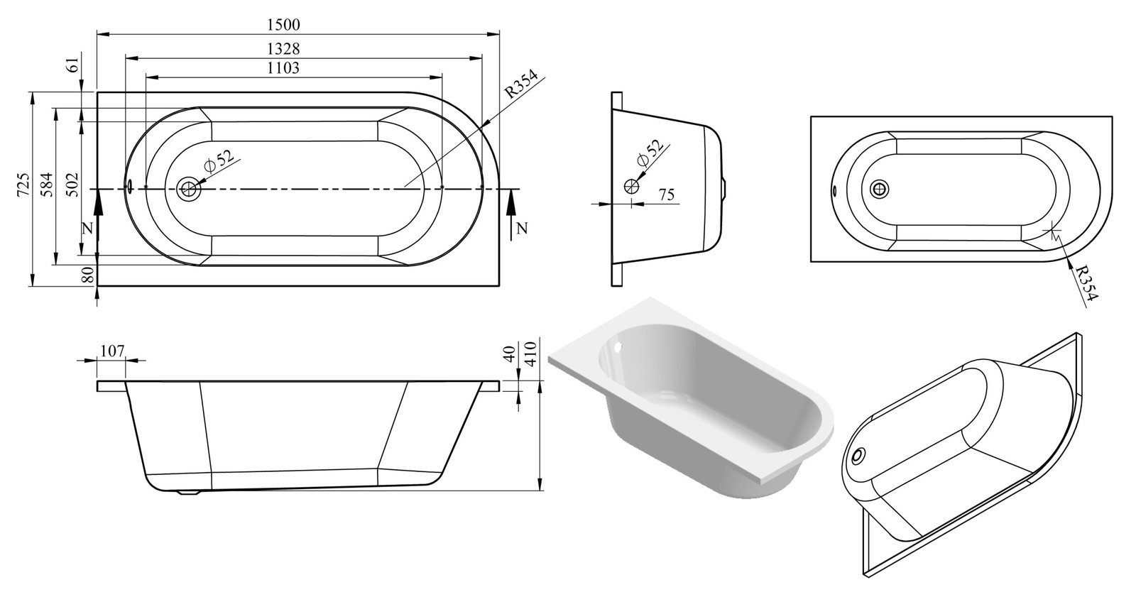 Sarva J Shape 1500x725x600mm 0TH Bath w/Legs (RH)