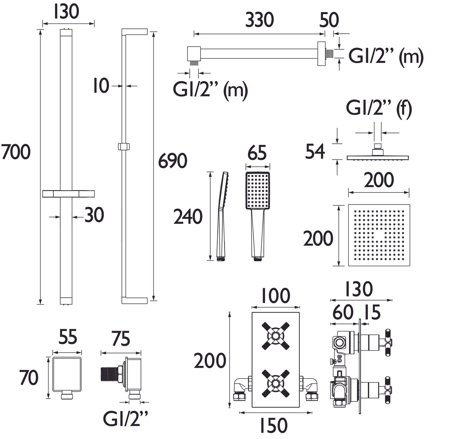 - All in one box – pack includes shower valve with integral two outlet diverter, slimline 200mm square drench head with shower arm, and shower kit with an adjustable riser rail plus a single function handset and wall outlet.