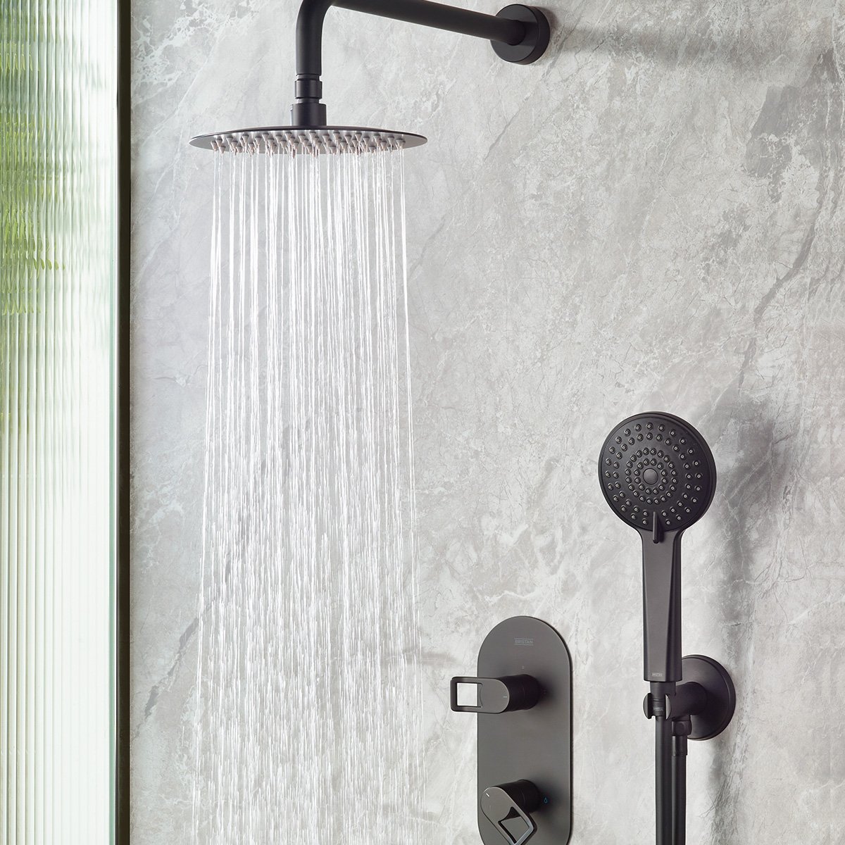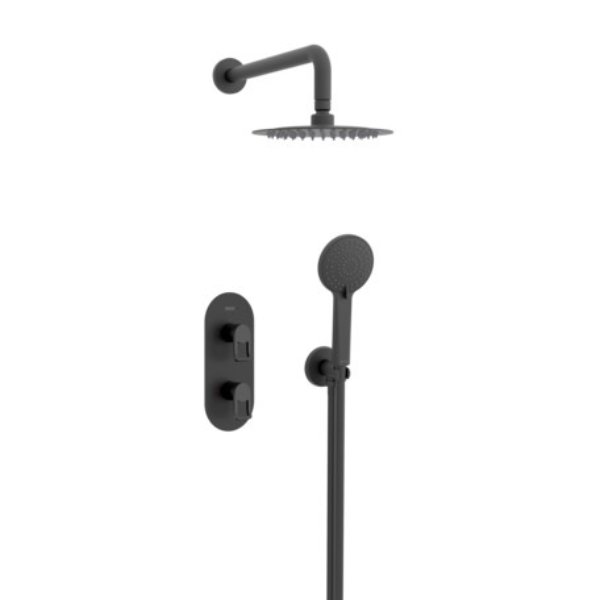 - All in one box – pack includes shower valve with integral two outlet diverter, slimline 200mm round drench head with shower arm, a multi function handset and wall outlet.