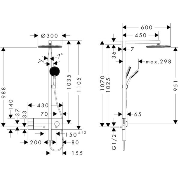 - consists of: overhead shower, hand shower, slider, thermostatic shower mixer, shower hose, shower rail