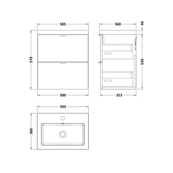 Hudson Reed Fusion 2 Drawer Wall Hung Vanity Unit With Polymarble Basin – 500mm Wide – 1 TH