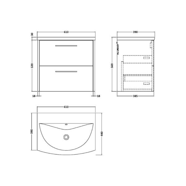 Tissino Mozzano 2 Drawer Wall Hung Vanity Unit With Cellini Basin – 600mm - Matt Grey