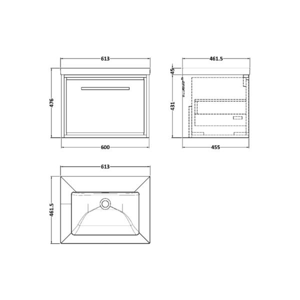 Hudson Reed Lille 1 Drawer Wall Hung Vanity Unit With Fireclay Basin – 600mm Wide – No TH
