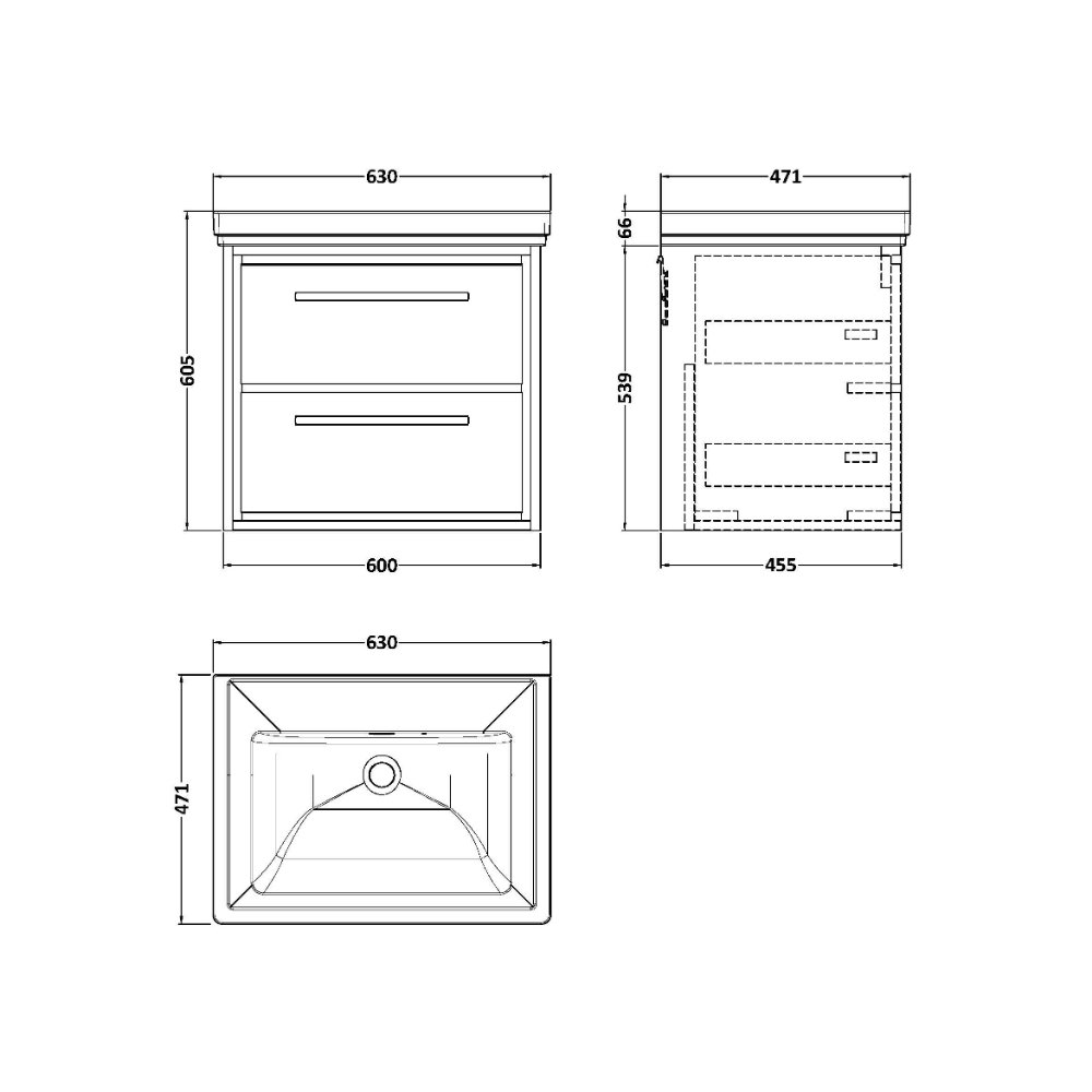 Hudson Reed Lille 2 Drawer Wall Hung Vanity Unit With Classic Fireclay Basin – 600mm Wide – No TH