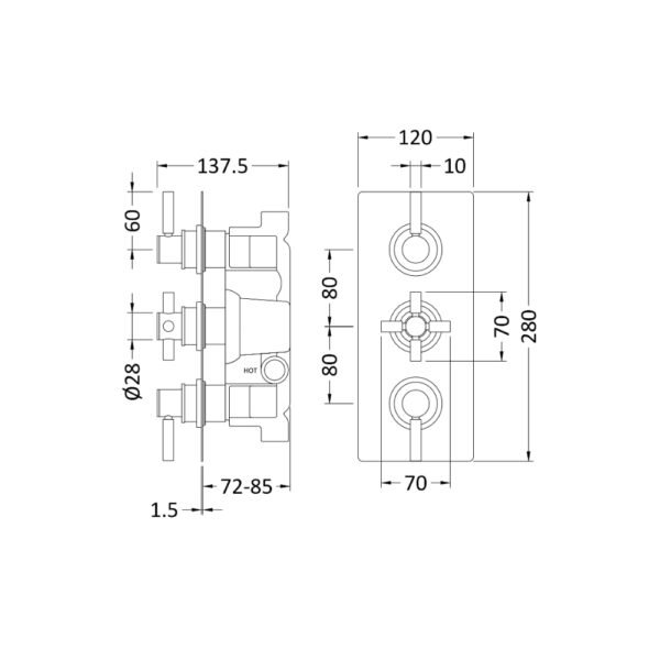 Vado Notion 2 Outlet 3 Handle Horizontal Thermostatic Shower Valve - Chrome