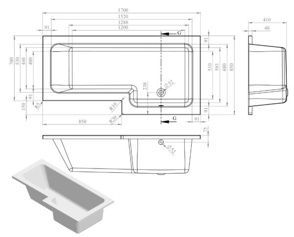 • Dimensions: L 1700 x W 850 x H 560mm
