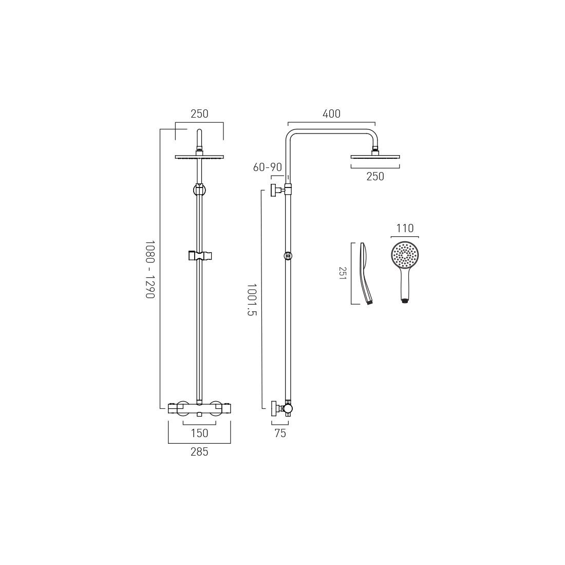- Shower Package Description: 1. Round thermostatic shower valve with integrated diverter, Rigid riser with single function shower head and shower handset, 250mm round shower head, 210mm height adjustment tolerance: min 1080mm ? max 1290mm, round thermostatic shower valve with integrated diverter, rigid riser with single function shower head and shower handset, 254mm round shower head, 232mm height adjustment tolerance: min 1016mm ? max 1248mm, 20mm depth adjustment tolerance: min 70mm ? max 90mm, Offset connectors and easy-fit brackets included